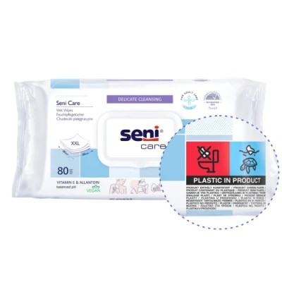 Dbamy o najwyższą jakość wszystkich produktów Seni Care. Chusteczki Seni Care z nowym oznakowaniem nie zostały w żaden sposób zmienione. Nowe oznakowanie wynika z ROZPORZĄDZENIA WYKONAWCZEGO KOMISJI (UE) 2020/2151 z dnia 17 grudnia 2020 r. do DYREKTYWY PARLAMENTU EUROPEJSKIEGO I RADY (UE) 2019/904 z dnia 5 czerwca 2019 r. w sprawie zmniejszenia wpływu niektórych produktów z tworzyw sztucznych na środowisko, które definiuje włókninę zastosowaną w chusteczkach jako plastik oraz wskazuje produkty tego typu jako jedne z najczęściej spotykanych odpadów w środowisku morskim.