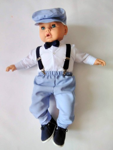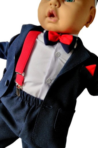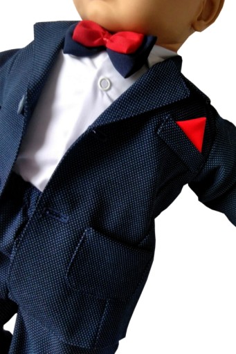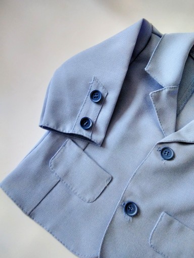 Marynarka uszyta z delikatnego materiału, miękka, nie krępuje ruchów maleństwa. Zapinana na ozdobne guziki w kolorze granatowym. Krój lekko zwężony, dzięki czemu bardzo ładnie się układa !!!