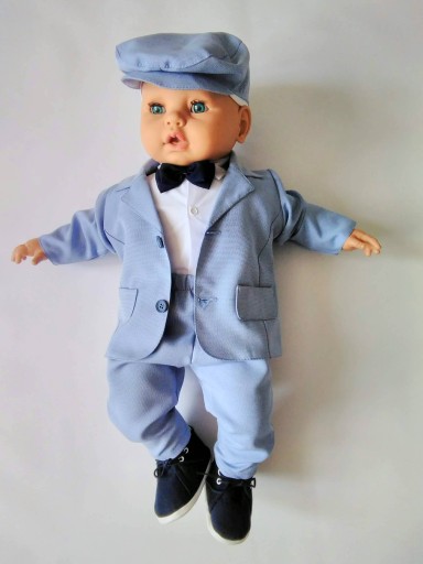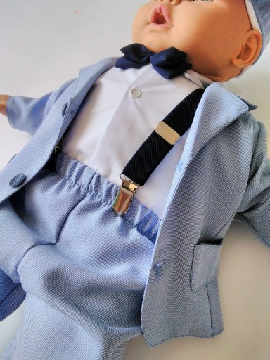Niesamowity 6 - częściowy komplet do chrztu dla chłopca wykonany z delikatnego materiału, pięknie skrojony, marynarka lekko taliowana, spodnie modne rurki