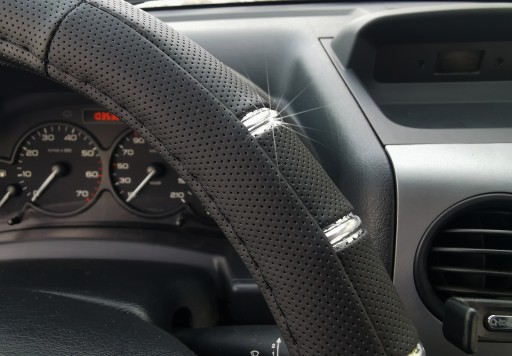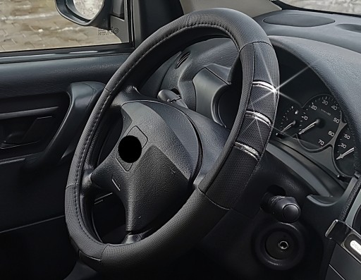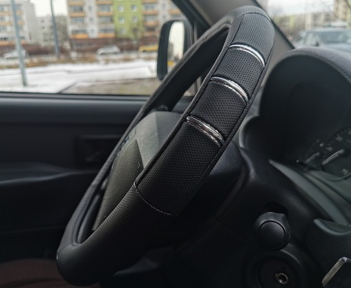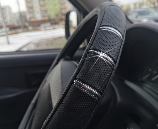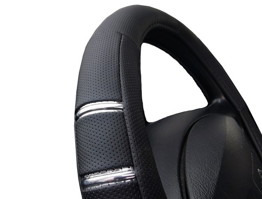 Bezzapachowy pokrowiec na kierownicę wykonany z perforowanej eko skóry połączonej z elementami chromu, pasuje do modeli o średnicy zewnętrznej kierownicy: od 37cm. do 38,5cm.