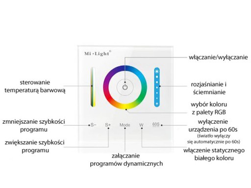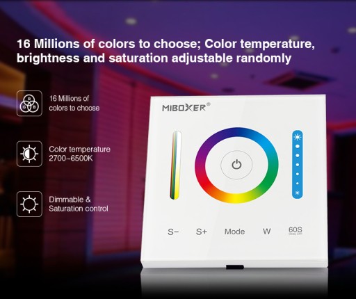 Kontroler naścienny P3 Mi-Light jest urządzeniem przeznaczonym do współpracy z kolorowymi taśmami LED RGB, RGBW lub RGB+CCT.