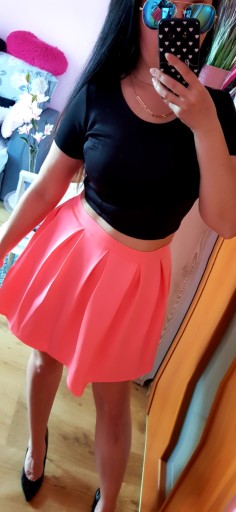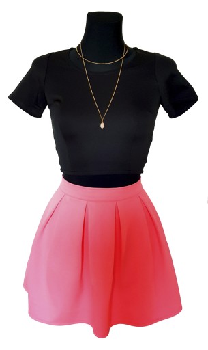 KOMPLET top ( czarny ) + spódniczka w zakładki mini ( neonowy róż ) :