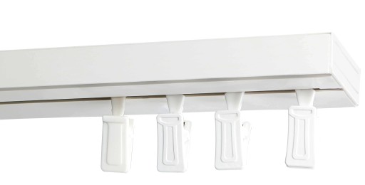 Standardowe upięcie stosowane do szyn pcv. Po wewnętrznej stronie żabki znajdują się ząbki, które zapobiegają wyślizgiwaniu się firan/zasłon.