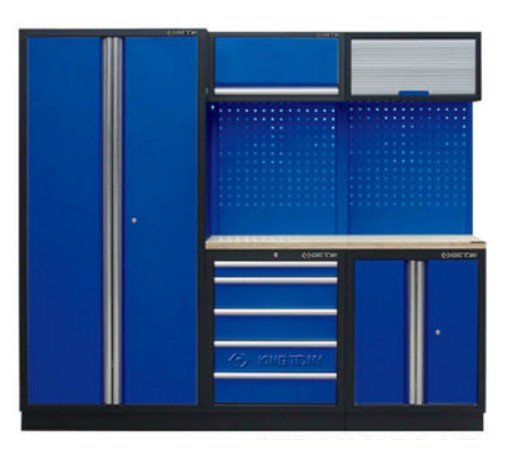 Zestaw mebli warsztatowych King Tony o wymiarach 2275 mm (dł.) x 460 mm (gł.) x 2000 mm (wys.). W skład zestawu wchodzi 5 szafek metalowych w tym:
