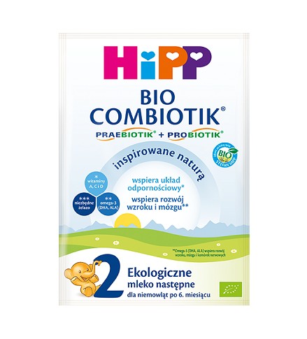Zastosowanie Mleko następne HiPP 2 BIO COMBIOTIK® jest dopasowane do potrzeb żywieniowych niemowląt po 6. miesiącu życia, które z różnych powodów nie mogą być karmione piersią. Mleko jest odpowiednie po zakończeniu karmienia piersią lub każdym mlekiem początkowym. Zgodnie z przepisami prawa regulującymi skład mleka dla niemowląt, zawiera witaminy A, C i D, żelazo oraz kwas dokozaheksaenowy (DHA) i kwas alfa-linolenowy (ALA). Gdy przejdziesz na mleko HiPP 2 BIO COMBIOTIK® z innego mleka początkowego lub następnego, stolce Twojego dziecka mogą stać się luźniejsze (podobne do stolców niemowląt karmionych piersią) – wynika to z zawartości galaktooligosacharydów (GOS).