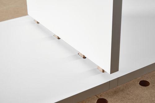 Specjalny kształt w połączeniu z pęczniejącymi „kieszeniami klejowymi” i bocznymi rowkami wzdłużnymi, sprawiają, że łączniki pewnie trzymają. Absolutnie stabilne połączenia, odporne na wykręcanie. Do tego, znacznie szybsza obróbka: dzięki ogranicznikom pierwszy otwór można łatwo umiejscowić i precyzyjnie wyciąć. Elementy zostają połączone szybko i dokładnie oraz równo z krawędzią. System DOMINO dopuszcza również drobne niedokładności przy dalszych otworach.
