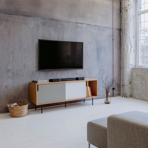 Cinebar Duett posiada zintegrowany uchwyt ścienny. Dwa otwory w ścianie wystarczą by z łatwością zawiesić soundbar. Oprócz tego soundbar pasuje dzięki swojej smukłej formie również pod telewizor.