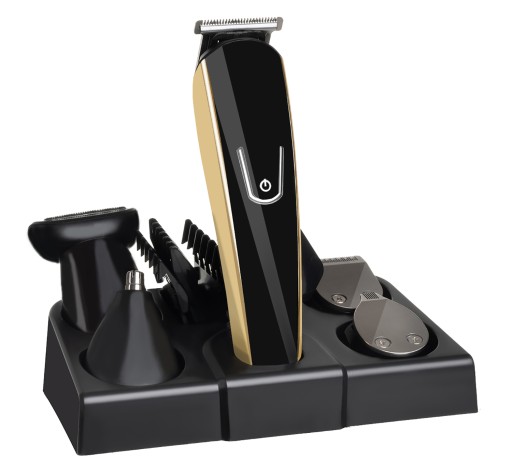 - WIELE ELEMENTÓW – maszynka do strzyżenia włosów wyposażona została w 5 nasadek. W tym trymer do nosa oraz nasadkę do golenia, a także 5 grzebieni prowadzących, kabel ładujący, stojak oraz olej smarujący i szczoteczkę do czyszczenia.
