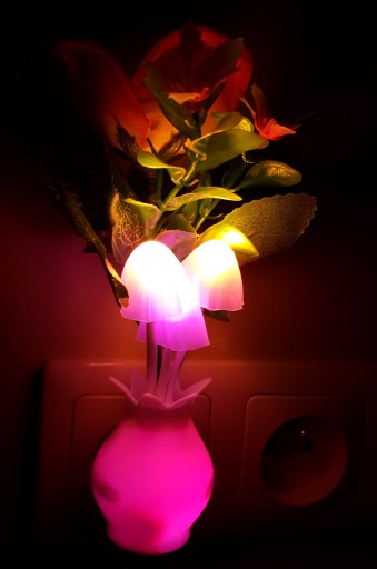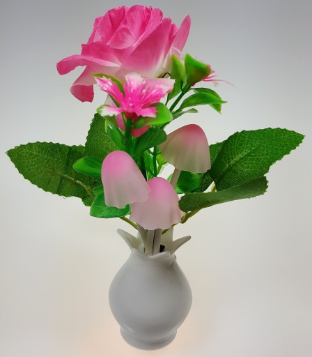 LAMPKA LED ZDOBIONA GRZYBKAMI I RÓŻOWĄ RÓŻĄ - czujnik zmierzchu