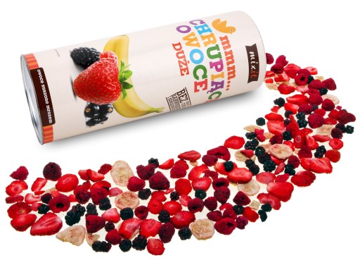 Duża tuba wypełniona chrupiącymi, suszonymi mrozem owocami. Posmakuj sobie malin, truskawek, jeżyn, czarnych porzeczek i bananów w najwyższej jakości formie bez konserwantów i innych dodatków. Doskonale smakuje i pachnie!