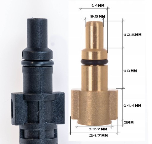 Aby uniknąć pomyłek w doborze Patio przedstawiamy zwymiarowaną złączkę, prosimy na wszelki wypadek przed zakupem o ich porównanie. Takie złącze jest przy wejściu do pistoletu myjek Lavor i Parkside.