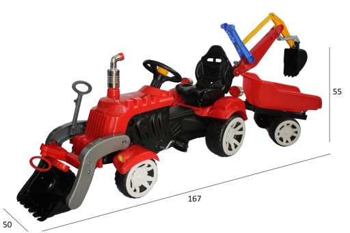 Duże wygodne i stabilnie osadzone siedzisko z oparciem zapewnia wygodną pozycję dziecku podczas jazdy i obsługi. Szeroko rozstawione i duże koła czynią zabawkę stabilną i bezpieczną, a poruszanie się po piasku, czy innym terenie nie sprawia większych trudności. Przednia oś skrętna za pośrednictwem kierownicy wyposażonej w klakson. Dodatkowymi gadżetami są reflektory, komin, osłony na koła i hak dzięki czemu traktorek przypomina prawdziwy pojazd. Do traktorka można przypiąć przyczepkę, która wyposażona jest w ruchomą skrzynię załadowczą, co ułatwia jej szybkie opróżnianie.