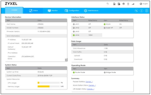 JW celu prostego zapamiętywania zostało stworzone jedno konto systemowe, którego możesz używać do logowania się do LTE3202-M430: „admin”. Administrator konto umożliwia pełny dostęp do wszystkich konfiguracji systemu. Domyślna nazwa użytkownika administratora to „admin” i hasło to „1234”.