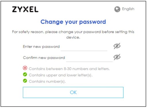 4. Poniższy ekran zostanie wyświetlony, jeśli nie zmieniłeś jeszcze hasła. Wprowadź nowe hasło, wpisz ponownie aby potwierdzić i kliknij OK.