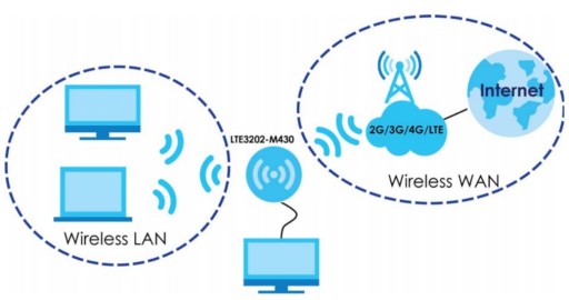 1. Tryb routera: jest to domyślny tryb pracy LTE3202-M430. Jeśli chcesz, użyj trybu routera do korzystania z funkcji routingu, takich jak zapora ogniowa, DHCP, NAT i tak dalej. Poniższy rysunek przedstawia przykład LTE3202-M430 w trybie routera.
