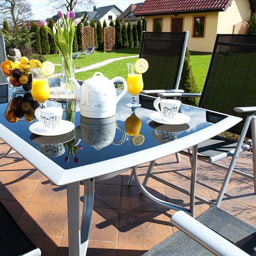 Konstrukcja stołu i krzeseł wykonana jest z wysokiej jakości aluminium która jest malowana farbą proszkową. Blat stołu zestawu VERONA to hartowane szkło z kolorze czarnym. Szklany blat posiada otwór z zaślepką do umieszczenia parasola. Składane krzesła z siedmiopozycyjną regulacją oparcia, sprawiają odczucie wygody i luksusu.
