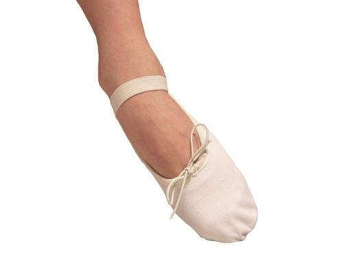 Dzielona podeszwa daje komfort miękkości i łatwość obciągnięcia palców. Wszyta cienka gumka wokół stopy służy do ściągnięcia i zawiązania, natomiast gumka wokół kostki dodatkowo utrzymuje baletkę na stopie.