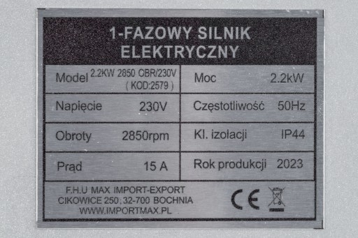 Silnik elektryczny jednofazowy ogólnego przeznaczenia, budowy zamkniętej. Silnik cechuje się mocą 2,2kW przy obrotach maksymalnych 2850rpm. Oznacza to, iż oferowany model jest wysokoobrotowy. Nadaje się on zarówno do napędzania kompresorów jak i innych urządzeń.
