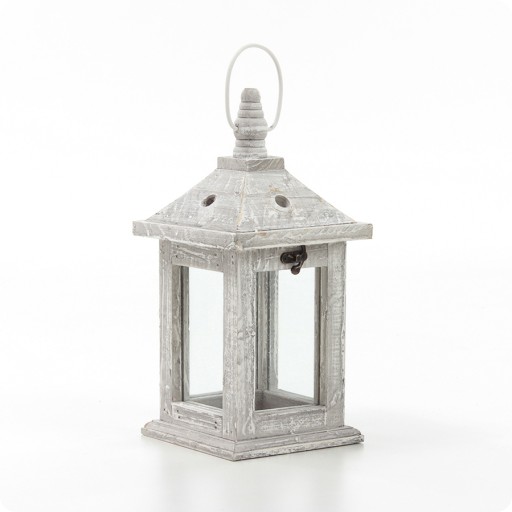 Mniejszy z kolekcji dwóch lampionów. Wykonany z drewna i przeszklony z każdej strony. Na samej górze uchwyt umożliwiający przenoszenie lub powieszenia