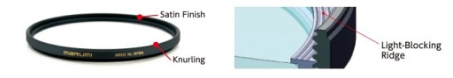 Tylko profesjonalne filtry posiadają wyczerniony brzeg szkła. Specjalna czarna farba naniesiona na szkło w miejscu jego odcięcia od tafli, gwarantuje skuteczną niwelację flar i refleksów które mogą się pojawiać w trakcie fotografowania w słoneczne dni lub w miejscach z silnymi bocznymi światłami.
