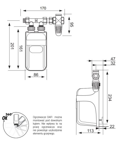 - Wymiary ogrzewacza:161 x 86 x 113 mm