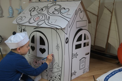 Zastosowaliśmy czarną grafikę aby była odpowiednia do kolorowania kredkami, farbami i flamastrami. Konstrukcja jest lekka i stabilna, dzięki przekładanym elementom na dachu i ściankach. Drzwi i okna się otwierają więc domek może służyć do zabawy w sklep, kwiaciarnię lub...chowanego.