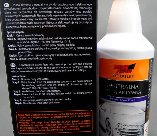 Moje Auto Detailer Neutralna Piana Aktywna o neutralnym pH do bezpiecznego i efektywnego mycia karoserii samochodów. Dzięki zastosowaniu nowoczesnej technologii piana jest bezpieczna dla wszelkiego rodzaju wosków oraz powłok ceramicznych i kwarcowych. Piana posiada wysokie właściwości pianotwórcze, które tworzą efekt śniegu na lakierze. Łatwo się spłukuje. Najlepszy efekt uzyskuje się przy użyciu pianownicy. Posiada przyjemny poziomkowy zapach.