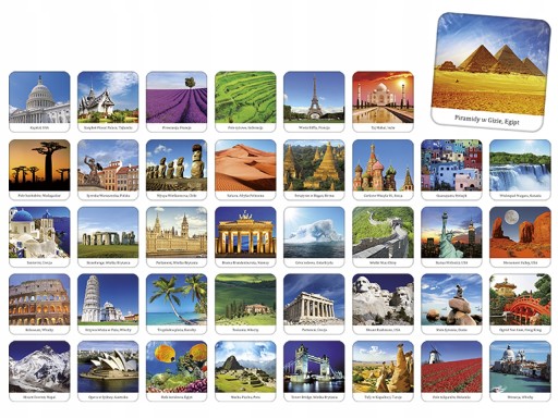 Pudełko zawiera 80 sztuk twardych tafelków, na których znajduje się 40 par zdjęć z najbardziej znanych zakątków pięknego świata.