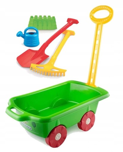 - Wózek z rączką, który znajdzie zastosowanie w zabawach w ogrodzie, piaskownicy, plaży i w domu.