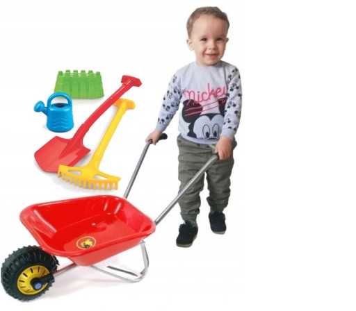 SKŁAD ZESTAWU: TACZKI DZIECIĘCE (z elementami metalowymi) + NARZĘDZIA (łopatka, grabki konewka i zamek)+wózek z rączką