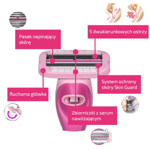 - Technologia Skin Guard wygładza powierzchnię skóry pod ostrzami, pomagając chronić ją przed podrażnieniami.