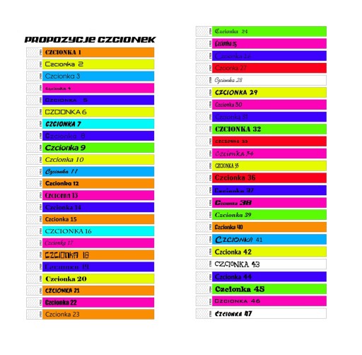 Z poniższych szablonów proszę wybrać czcionkę która Państwa interesuje. W wiadomości dla sprzedającego proszę napisać numer czcionki, kolor opasek oraz treść nadruku jaka ma być umieszczona na opaskach + ewentualne logo proszę przesłać na naszego maila.