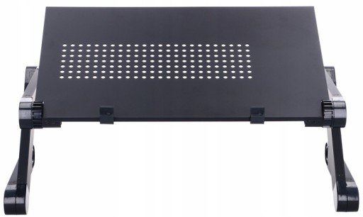 Aluminiowy stolik pod laptopa z podkładką pod mysz komputerową.