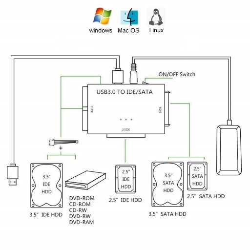 Obsługuje dysk twardy SATA 2,5 "/ 3,5" do 4 TB, dysk twardy IDE 2,5 "/ 3,5". Pozwala obsługiwać dwa dyski twarde IDE i jeden dysk twardy SATA jednocześnie lub osobno.