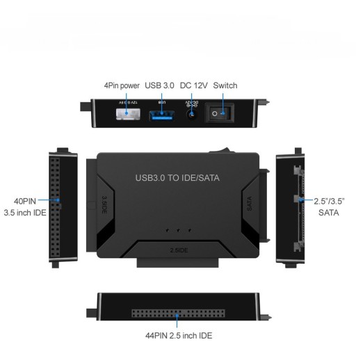 Konwerter (mostek) USB 3.0 na SATA/ IDE łączy dyski twarde IDE / SATA 2,5 "/ 3,5" z komputerem przez port USB. Pozwala szybko przesyłać duże ilości danych z jednego dysku na drugi. Posiada złącze SATA II i dwa złącza IDE (40-pinowe i 44-pinowe), wszystkie trzy dyski twarde mogą działać jednocześnie. Jest to idealny sposób zwiększenie pojemności w notebooku lub komputerze stacjonarnym.