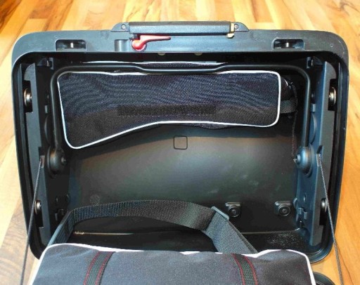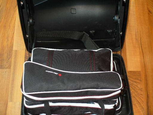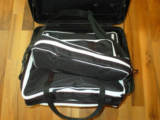 Duża zajmująca główną część kufra oraz mniejsza wypełniająca miejsce wycięcia. Małą torbę można połączyć z