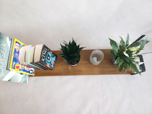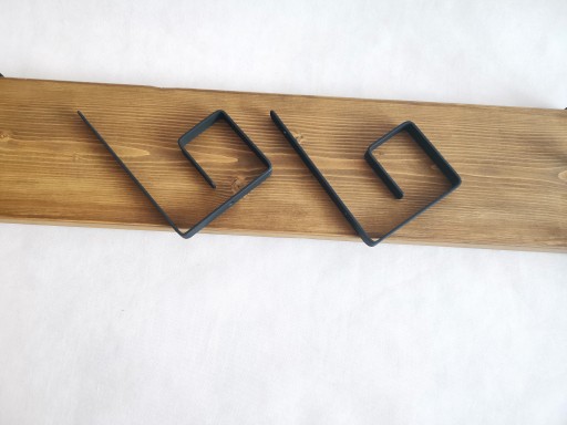 Wykonany z deski sosnowej szlifowanej zdjęciu deska malowana na kolor ciemnego dębu , oraz płaskownika 25x4 mm , 2 otwory do ściany i jeden otwór pod deskę
