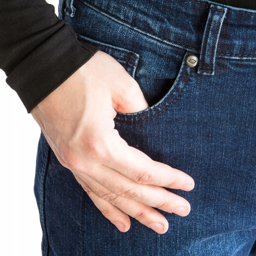 Bezpieczeństwo motocyklisty w razie upadku zapewniają wspomniane powyżej certyfikowane protektory kolan umieszczone w łatwo dostępnych kieszeniach. Co ważne dostęp do protektorów zapewniają zewnętrzne ekspresy (ukryte pod patkami), co umożliwia ich bezproblemowe i szybkie wyjęcie bez potrzeby zdejmowania spodni np. po dojechaniu do pracy.