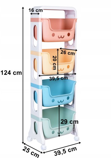 Kolorowa praktyczna szafka Bobby pozwoli utrzymać porządek w pokoju Twojego dziecka. Regał posiada aż 4 pojemniki, dzięki czemu zmieści mnóstwo zabawek. Przesuwanie szafki ułatwiają kółka z hamulcami. Przyjemne pastelowe barwy świetnie pasują do pokoi dziecięcych. Regał wykonano z elastycznego i trwałego tworzywa sztucznego. Łatwy do utrzymania w czystości, wystarczy czyścić wilgotną ściereczką.
