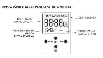 PRACA PÓŁAUTOMATYCZNA – możliwość ręcznego włączenia/wyłączenia styku podczas pracy automatycznej. Zmiana obowiązywać będzie do momentu kolejnego włączenia/wyłączenia wynikającego z cyklu pracy automatycznej [pulsujący symbol na wyświetlaczu z lewej strony].