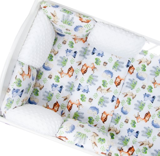 - 6 poduszeczek ok.30cmx30cm z troczkami tworzących ochraniacz do łóżeczka ( 3 poduszeczki minky i 3 poduszeczki bawełniane)