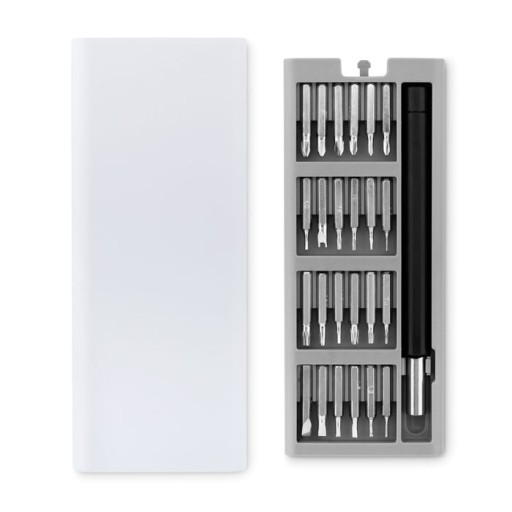 24- częściowy zestaw śrubokrętów do precyzyjnej naprawy małych elementów, w pudełku z ABS z otwarciem typu push.