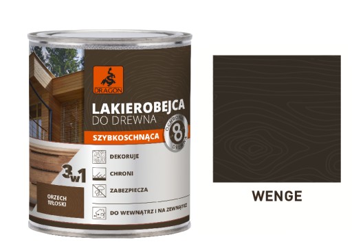 Szybkoschnaca Lakierobejca Dragon to wysokiej jakości produkt ochronno – dekoracyjny do zabezpieczenia drewna zarówno wewnątrz pomieszczeń jak i na zewnatrz. Dzięki zaawansowanej formule 3 w 1 idealnie sprawdzi sie jako produkt, który impregnuje drewno, nadaje kolor i chroni na lata.
