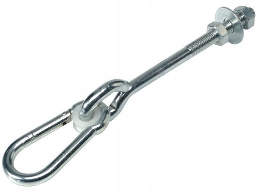 Mocowanie do huśtawki ogrodowej z karabińczykiem całość pokryta powłoką galwanizacyjną, co zapobiega korozjii.