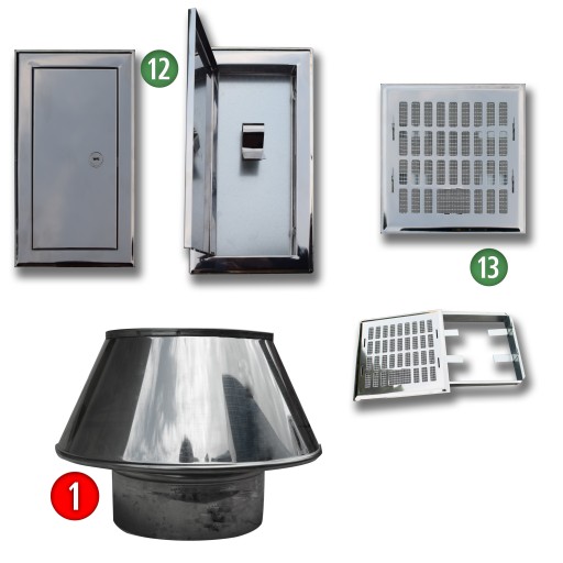 NASADA KOMINOWA STOŻEK (DYFUZOR) (1) jako zakończenie komina. Główną zaletą tego elementu jest zabezpieczenie wełny znajdującej się wokół rury ceramicznej przed warunkami atmosferycznymi.