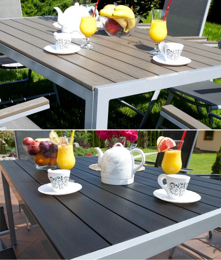 Blat stołu to wodoodporna deska WPC. Idealnie imituje drewno a zarazem trwały na wiele lat