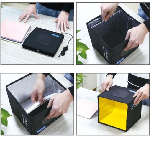 - Namiot bezcieniowy 25x25x25cm z wbudowanym światłem LED RING (26LM / 10W) oraz kablem USB do zasilania