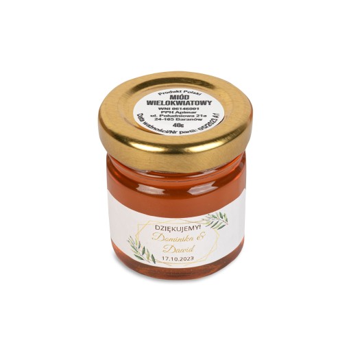 Ozdobne słoiczki 40ml wypełnione prawdziwym miodem wielokwiatowym wraz z naklejką personalizowaną, woreczkiem z organzy oraz drewnianą łyżeczką jako podziękowanie dla gości.