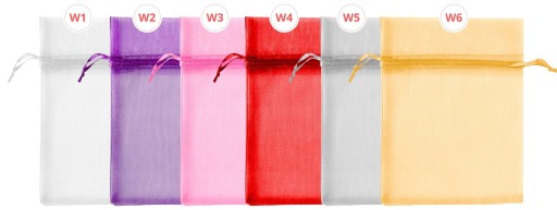 - Do wyboru 6 kolorów woreczków z organzy 11x14cm