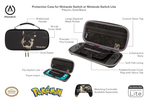 Ciesz się swoją pasją do Pokémonów dzięki temu oficjalnie licencjonowanemu futerałowi z wzorem Pikachu Gold, wyściełanej klapce na ekran z 6 miejscami na karty do gier i gumowanym uchwytem do ochrony i przechowywania Nintendo Switch, Nintendo Switch OLED lub Nintendo Switch Lite.